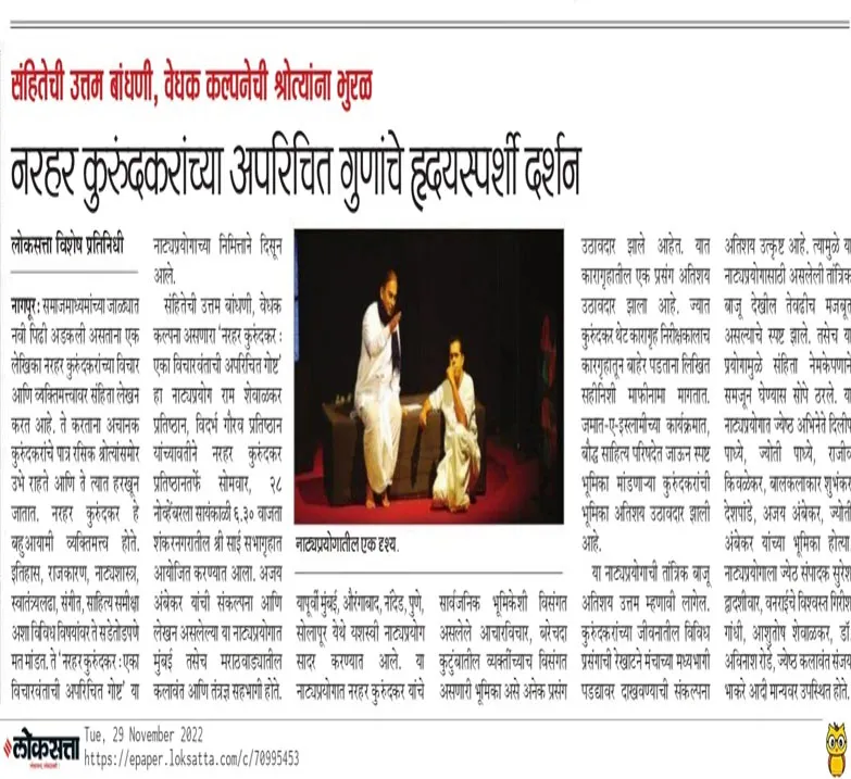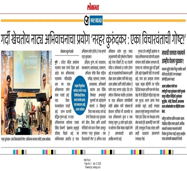 अभिनव सादरीकरण: ज्येष्ठ कलाकार अजय अंबेकर आणि ज्योती अंबेकर यांच्या सहज आणि अभ्यासपूर्ण सादरीकरणातून कुरुंदकरांचे बहुआयामी व्यक्तिमत्त्व जिवंत होते. हा नाट्यप्रयोग एका प्रज्ञावंत व्यक्तिमत्त्वाच्या अंतरंगात डोकावण्याची संधी देतो.